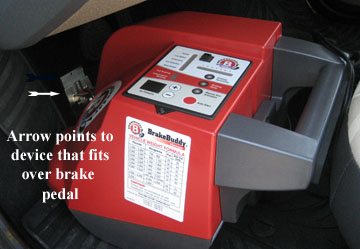 Here's what you have to do. It has an arm with a cap on the end that fits over the brake pedal. So first put the driver's seat way back, lug the buddy onto the floor, and fit the cap on the brake pedal without putting any pressure on the pedal. Then snug it up again without putting pressure on the pedal, then pull the seat forward (ours is not electric) until it braces the buddy but still doesn't put any pressure on the brake pedal.