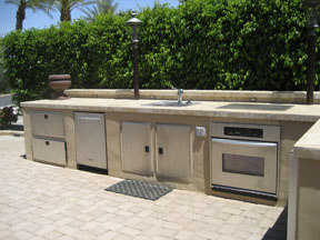 Sites are gathered around 3 to 4 putting greens. Members can put 18 holes. Each site can be improved by the owner. Many add outside grilles, fireplaces, lighting, etc. Our site had lots of improvements — a full kitchen with dishwasher, refrigerator, oven and cook top. Next to it was a sort of lanai with a gas fireplace and ceiling fan.