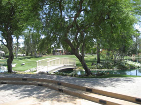 These are views from the back of the lot. The left picture is a waterfall. The right shows the bridge to the putting greens. The look of the place reminds me of Laurel Oak. They have 400 lots and yes, a homeowners' association. If it weren't so hot here, we'd be tempted to spend a month or two.