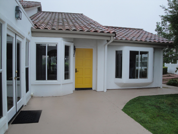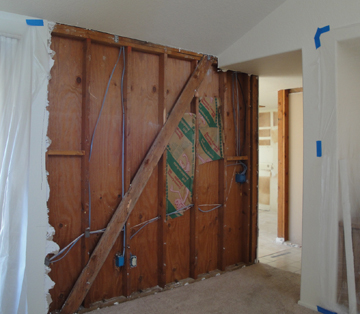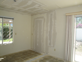 Ken's office was odd. Someone early on had added a 13x11 room, exited with a set of sliders. Then they built a 5 ft. wide room at the end of it, with the only entrance from outside. It seemed to be just an outside storage room, but it had a window onto the patio. So, we had the wall torn down and now the room is 13x18. Left below are the joists left after the wallboard was removed. You can see the outside door, and the window (covered). After all the wall was gone, they covered up the door so it no longer exists.