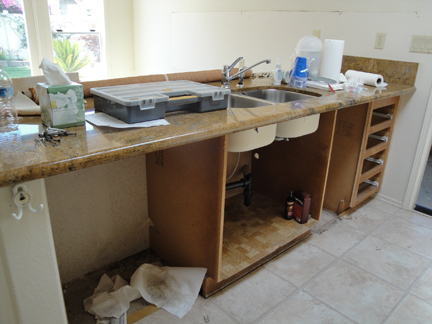 The kitchen will get all new cabinets, made of the maple and finished in light oak, just like the stairs. Here are two "before" pictures. We kept the granite and are working around it. The leftmost picture is what the cabinets looked like before (they had refaced them).