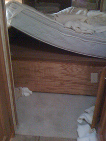 Surprisingly, Ken's iMac, which was stored under the bed, was gone also. You can see where they lifted the mattress. Under the bed was the computer, where now only a lonely cord resides.
