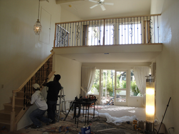 A local company called Staircrafter and its owner Gregg Kuzara and team began the dismantling. The stair wall and loft walls came down. We decided on maple wood railings with black wrought iron balusters with a curly pattern similar to the musical treble clef (we're going to put the piano up on the loft). The steps would be wood with grit added to make them slip-safe. Gregg made the step a little longer so that Ken's big feet would fit. The last thing they did was to apply a germ preventor to the hand rails. This stuff will last two years, according to Gregg. It's a new technology that is being used in hospitals, and he included it at no cost to us.