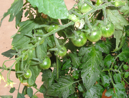 In the last chapter you saw pictures of the upside-down-tomato growing device. Actually, they did pretty well. They started to drag on the patio so we had to tie them up.
