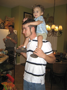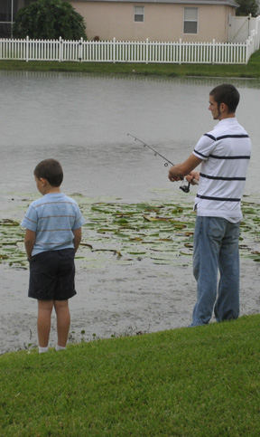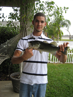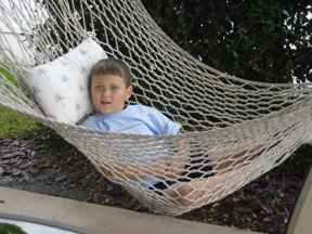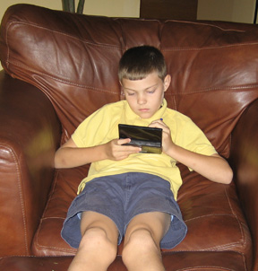 Before dinner, Tom took Ryan to the lake to show him how to fish. Tom caught two nice bass. One is pictured here. You can see all that work took a toll on Ryan, who rested later in the hammock. Tommy enjoyed his electronic game.
