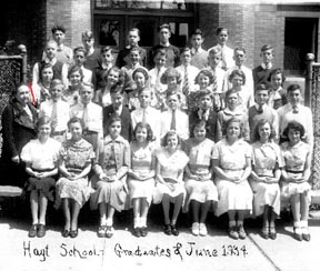 It's now December of 1971, and what do you know. That doggone big bird (while it knew it wasn't too welcome at the Johnson household), did manage to find an open window at the Lake Land Hospital in Elkhorn, Wisconsin. This time it deposited a precious bundle in the bed of one Carol Johnson Dahl. We welcomed to our house our very first grand daughter, Jennifer Michelle Dahl. Man, time is marching on too fast now that we're grandparents. Only yesterday, I was in the eighth grade being glowered at by Clara B. Poulson. I have to add a little aside right here to let folks know about Clara B. Poulson. Miss Poulson was my eighth grade teacher. She was a teacher whose path was not to be crossed you can probably tell this by looking at her in the picture. Please note that she is standing next to one Charles Roland August Johnson, AKA Pleto, and it certainly appears that she has pinned my arm behind my back to insure that I dont screw up the photograph. Miss Poulson had the uncanny knack of making every one in her class feel as though she was staring just at you, if you just happened to look up from your text book toward her desk!