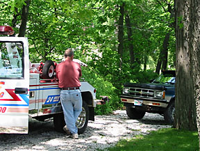 | June 9: Day of the memorial service. Everyone met at Don's house. The big excitement (other than getting everyone dressed and the house picked up), was Don and Sharon's good friend Mary, who brought over some tables and chairs, and got stuck in the driveway. Mary is holding the beloved Taco. | |||||||||||||||||||||||||||||||||||||||||||