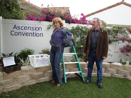 Placed around thoughtfully, was a laundry basket for putting neatly-folded clothes into, before the ascension, and a ladder to help short people. On the left there was a container for wallets and other important items. Below right, Debbie Pfeiffer begins moving her clothes to the laundry basket as her husband Don looks on skeptically.