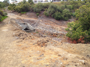 We took a walk through the canyon that has all new bushes and ground cover, a low-water solution to what had been all grass. There are benches throughout (we saw friends Art and Jan with their dog Chloe). The Western end has a catch basin for flood water (what floods??).